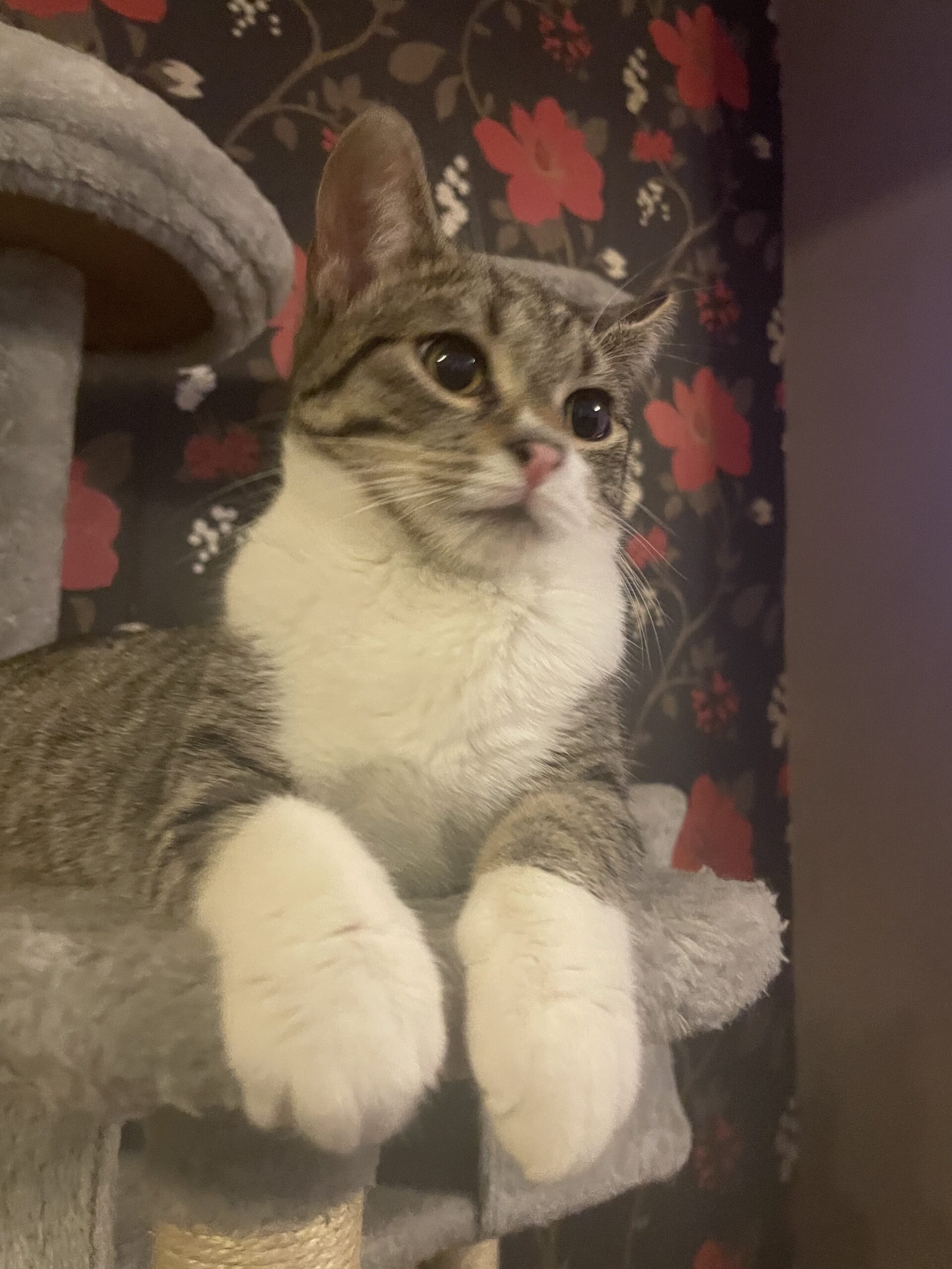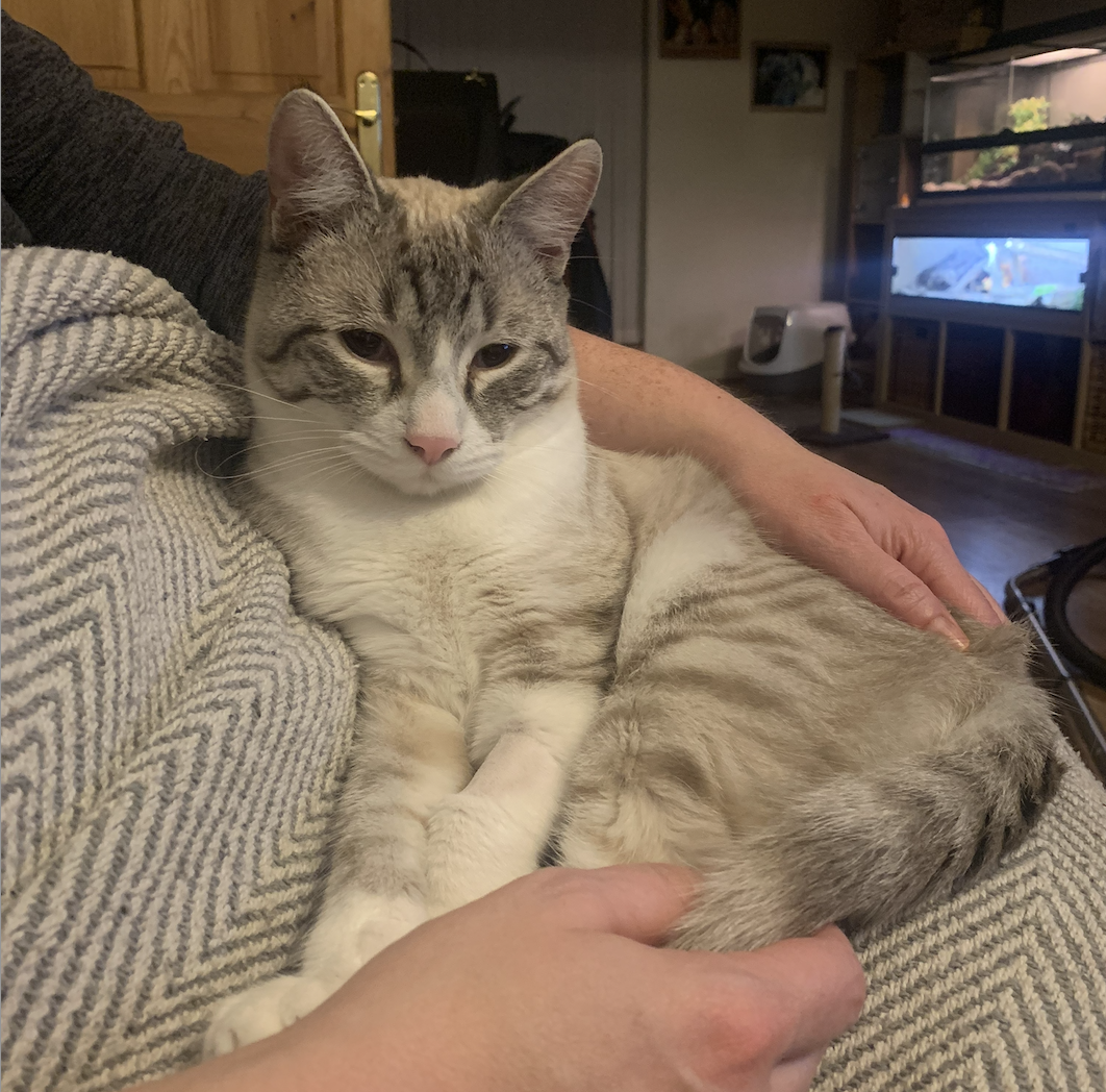 Alvin is a striking tabby in shades of greyish-brown and white. He’s a gentle giant with a timid but very sweet nature. Alvin enjoys playing but often hangs back at first, watching Honey until he feels safe enough to join in. He’s just started venturing onto a lap so there will no stopping the cuddles now!