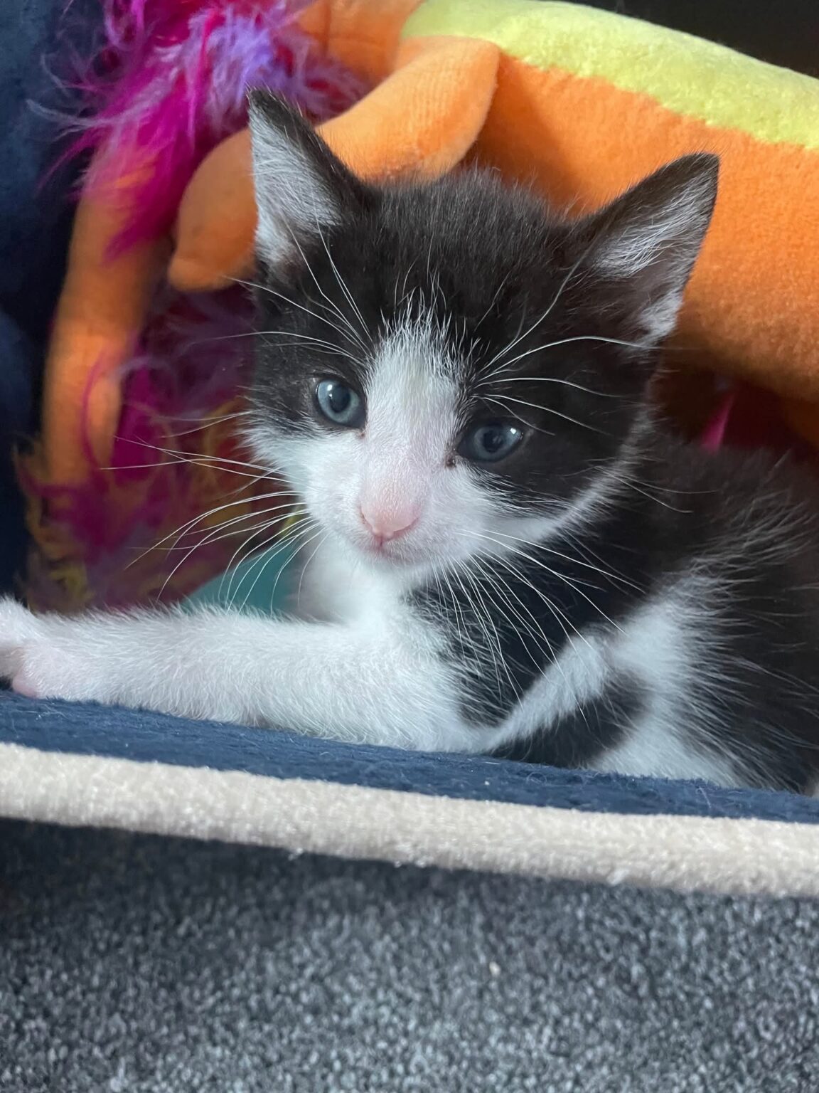 Phoenix – A scrappy snuggler he is always in the middle of a tumble but just as quick to curl up for cuddles. He’s affectionate, sweet, and loves a good nap after playtime.